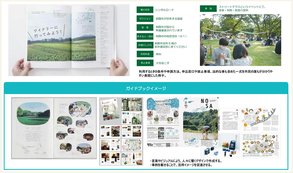 あさか市民に向けた、あさかにある公共空間や遊休不動産、その他利活用可能な場所や空間をどのようにしたら使えるのか、事例とともに紹介する。使いみちの意見をもらうアンケートの実施、シンボルロードの管理運営を考える会などで意見交換しながら作成中。
