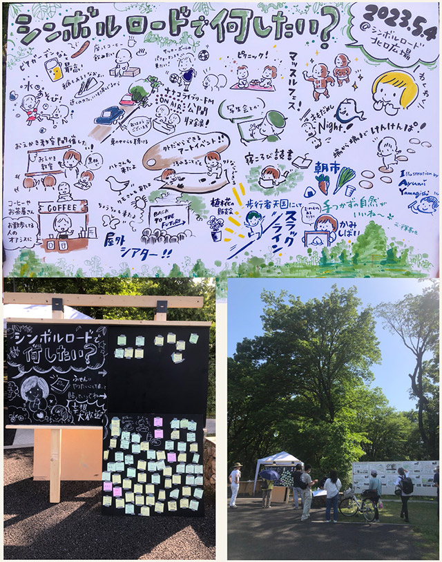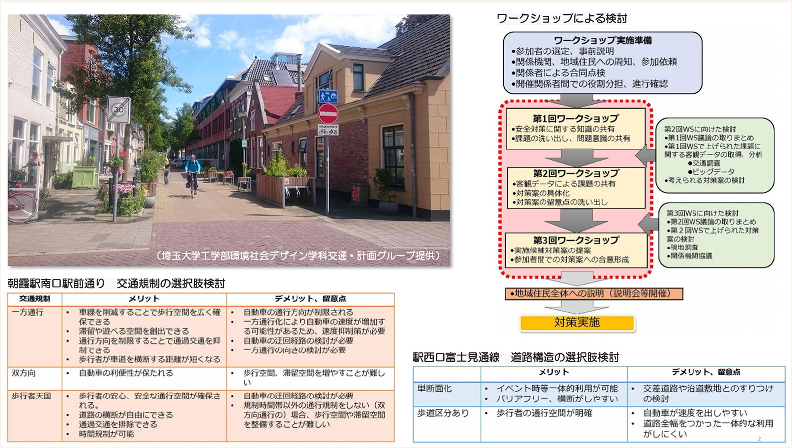人中心のみちの形成に向け、ワークショップなどを通じた意見交換を行う。 一方通行化等の交通規制により、自転車も自動車も歩行者の速度で走る車道の実現を目指し、市民参加のワークショップや実証実験を行う。