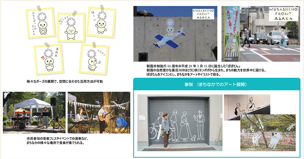 アイコンとなるイラストやアートをまち全体に展開し、人々の目にとまることで、あさかエリアデザイン会議を周知させる。まち全体を彩り、日常はもちろん、イベント等でも様々な活用が期待できる。