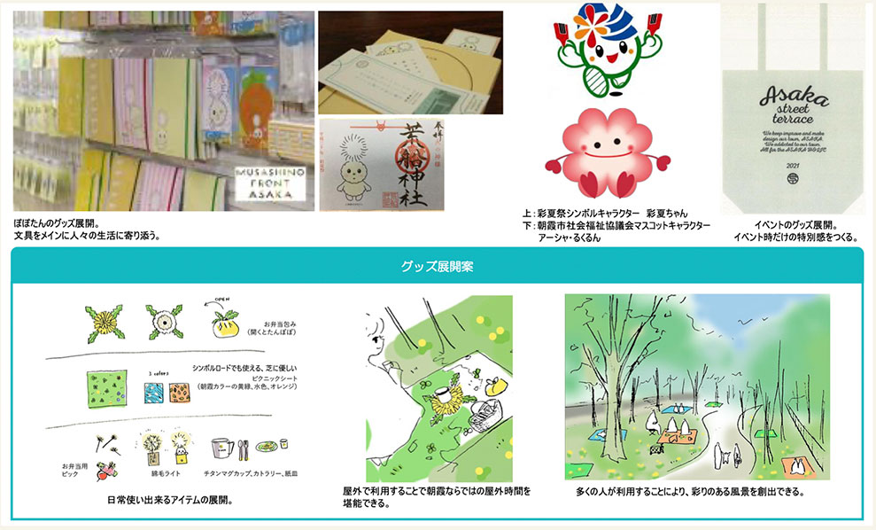 日常生活に溶け込む様々なアイテムを展開し、人々が活動することで幅広く魅力をアピールする。また、イベントオリジナルグッズの制作により活動の周知を狙う。
