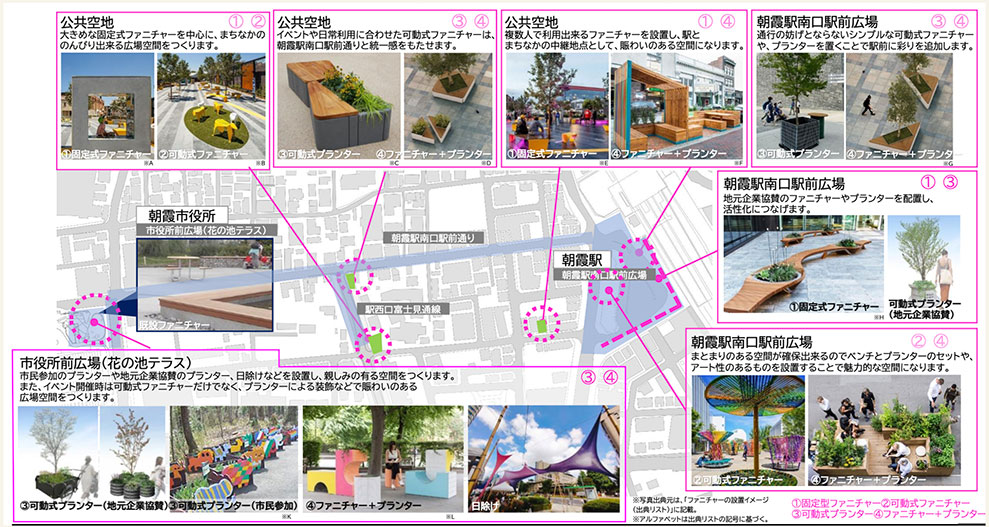 朝霞駅南口駅前通りを候補とし、駅前通のエリアごとの特色を活かし、店舗のにぎわいを道までにじみ出させ、人々の流れを商店の奥まで呼び込む。駅前の飲食店やスーパーなど生活に密着する「Living Street」エリア、空き店舗等を有効活用する「Art Street」エリア、中間地点で駅西口富士見通線との結節点の「Cross Point」エリアなど。